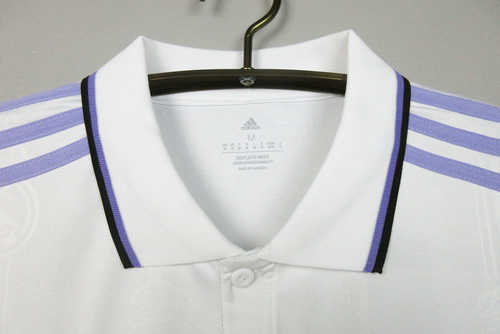 Sencilla, clásica v creada para marcar un hito. Esta camiseta adidas de la primera equipación del Real Madrid luce detalles en morado claro y el escudo del club repetido sobre el fondo blanco. Esta versión para jóvenes aficionados te permite animar con comodidad gracias a su tejido transpirable AEROREADY que mantiene la piel seca. Este producto se ha fabricado con un 100% de material reciclado. Su objetivo es plantear otra solución más que avude a eliminar los residuos plásticos. Detalles: Corte clásico Cuello de polo de canalé con cierre de botones Interlock 100% poliéster reciclado Tejido transpirable AEROREADY Inserciones de malla bajo las sisas